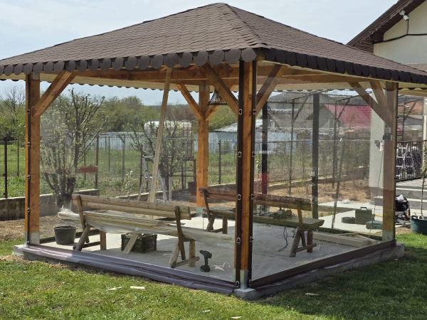 Pe langa un aspect placut, inchiderea cu folie transparenta aduce confort in orice sezon. Vara protejeaza de vant si ploaie, iar iarna pastreaza caldura si impiedica patrunderea frigului. Este o investitie care creste valoarea si functionalitatea spatiului tau exterior.